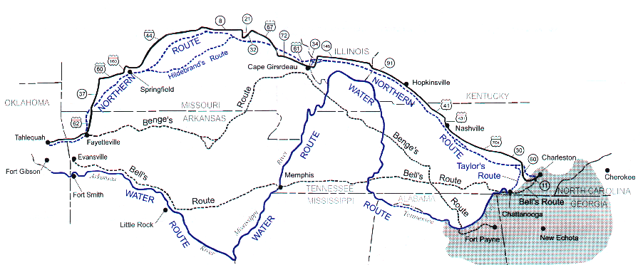 Three groups left in the summer, traveling from present-day Chattanooga by rail, boat, and wagon, primarily on the Water Route. But river levels were too low for navigation; one group, traveling overland in Arkansas, suffered three to five deaths each day due to illness and drought.